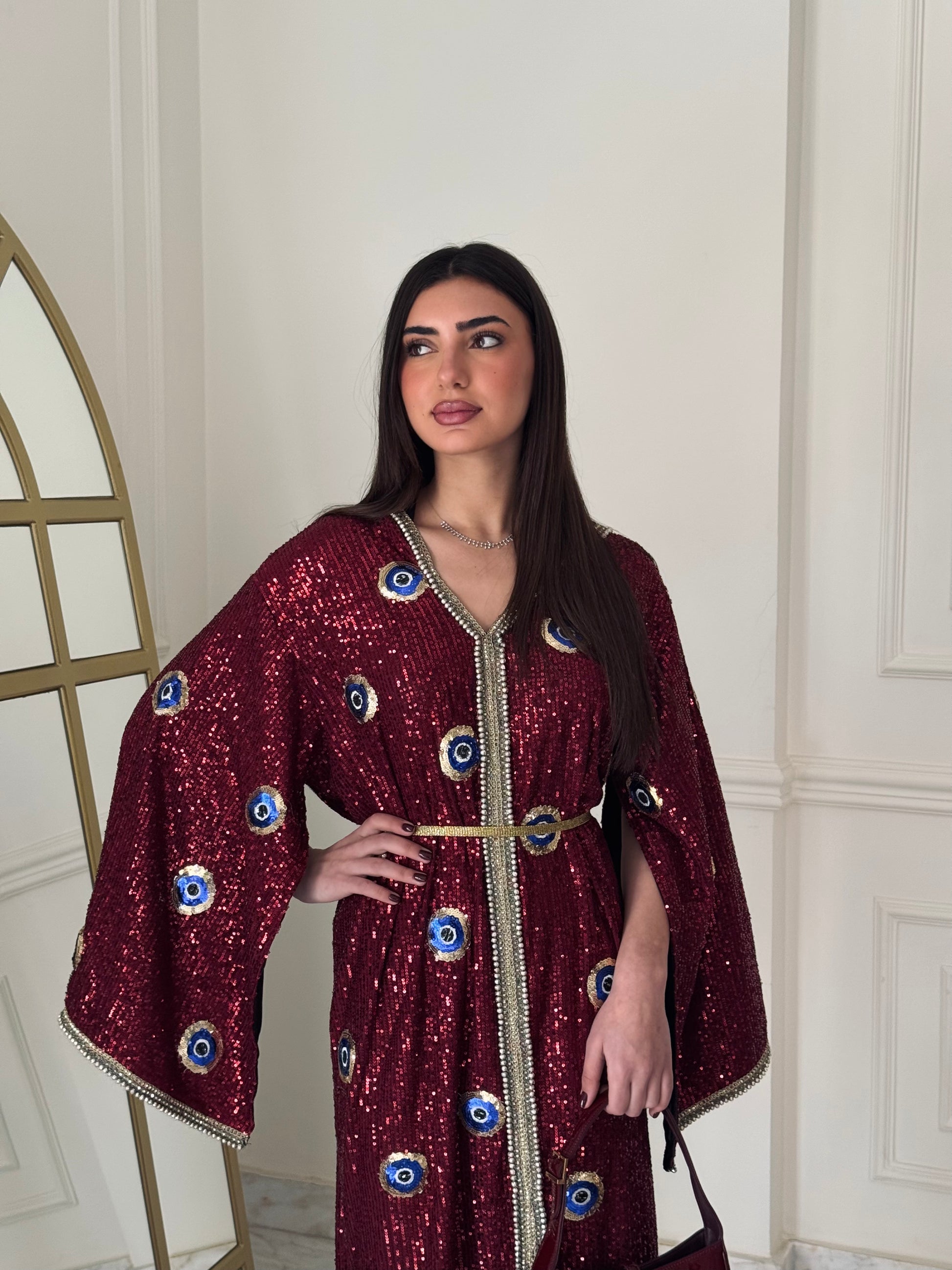 Unleash your inner diva with the Burgundy Evil Eye Dress! This kaftan style dress features a mesmerizing burgundy evil eye design, embellished with eye-catching sequins. Stand out in this new and unique dress that will surely turn heads at any event.