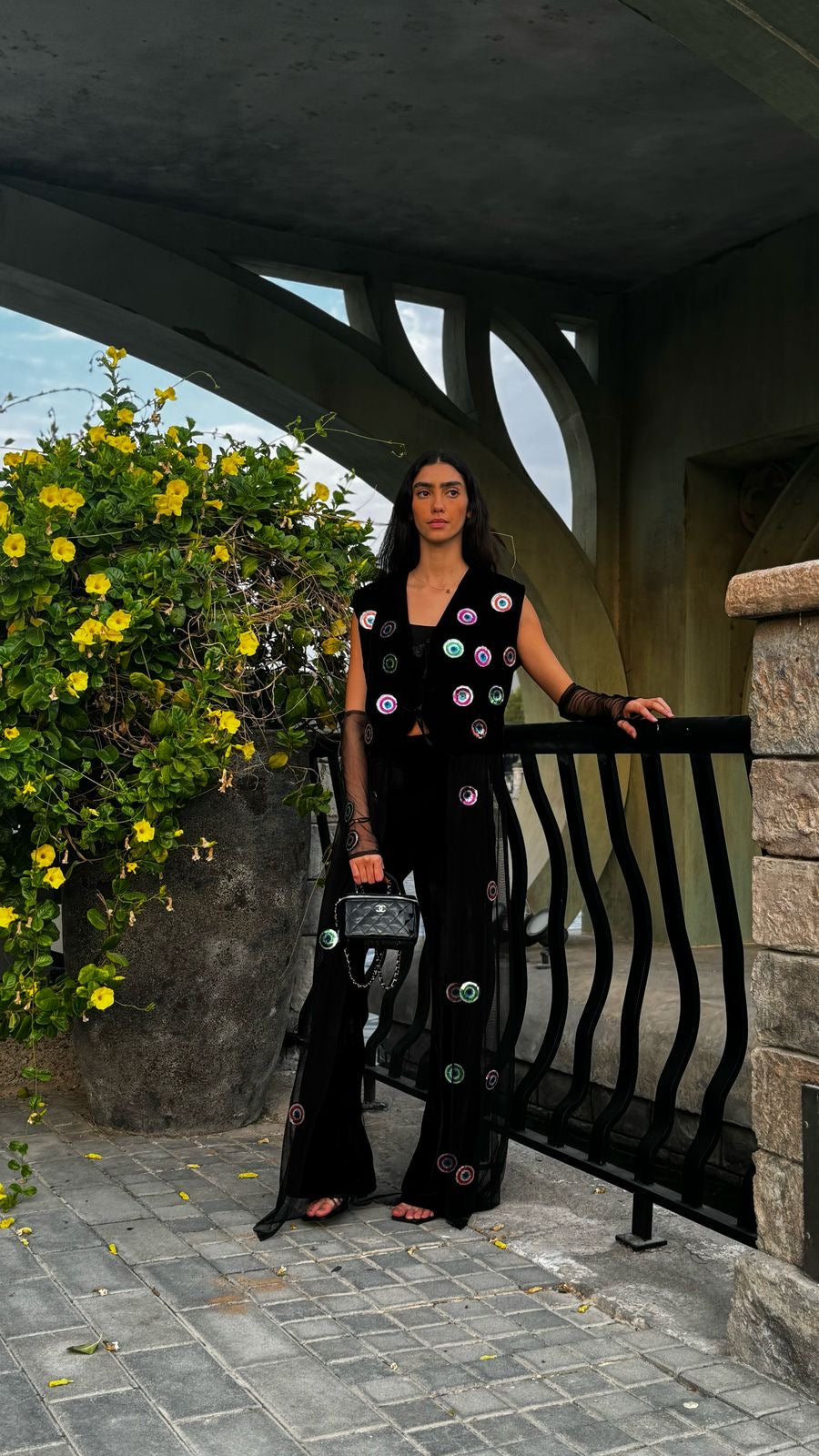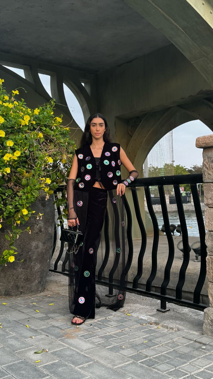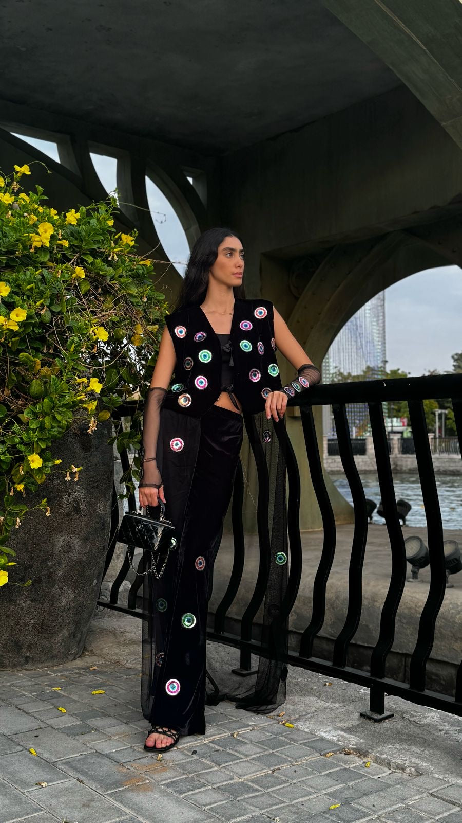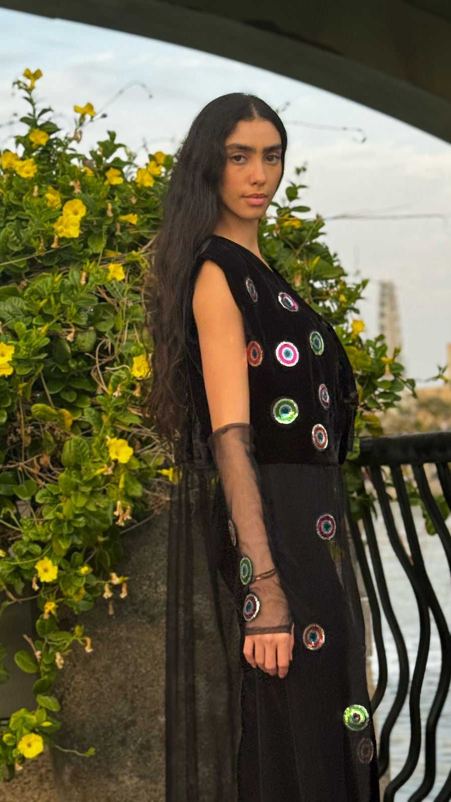 The Shadow Set is the perfect blend of mystery and elegance. Featuring a sleeveless black velvet vest adorned with shimmering evil eye embellishments, this set exudes a bold yet refined look. The flowy sheer tulle dress underneath adds movement and sophistication, making it ideal for evening events, Ramadan gatherings, or statement everyday styling. Whether worn together for a dramatic effect or styled separately, the Shadow Set is a timeless piece that embodies effortless glamour.