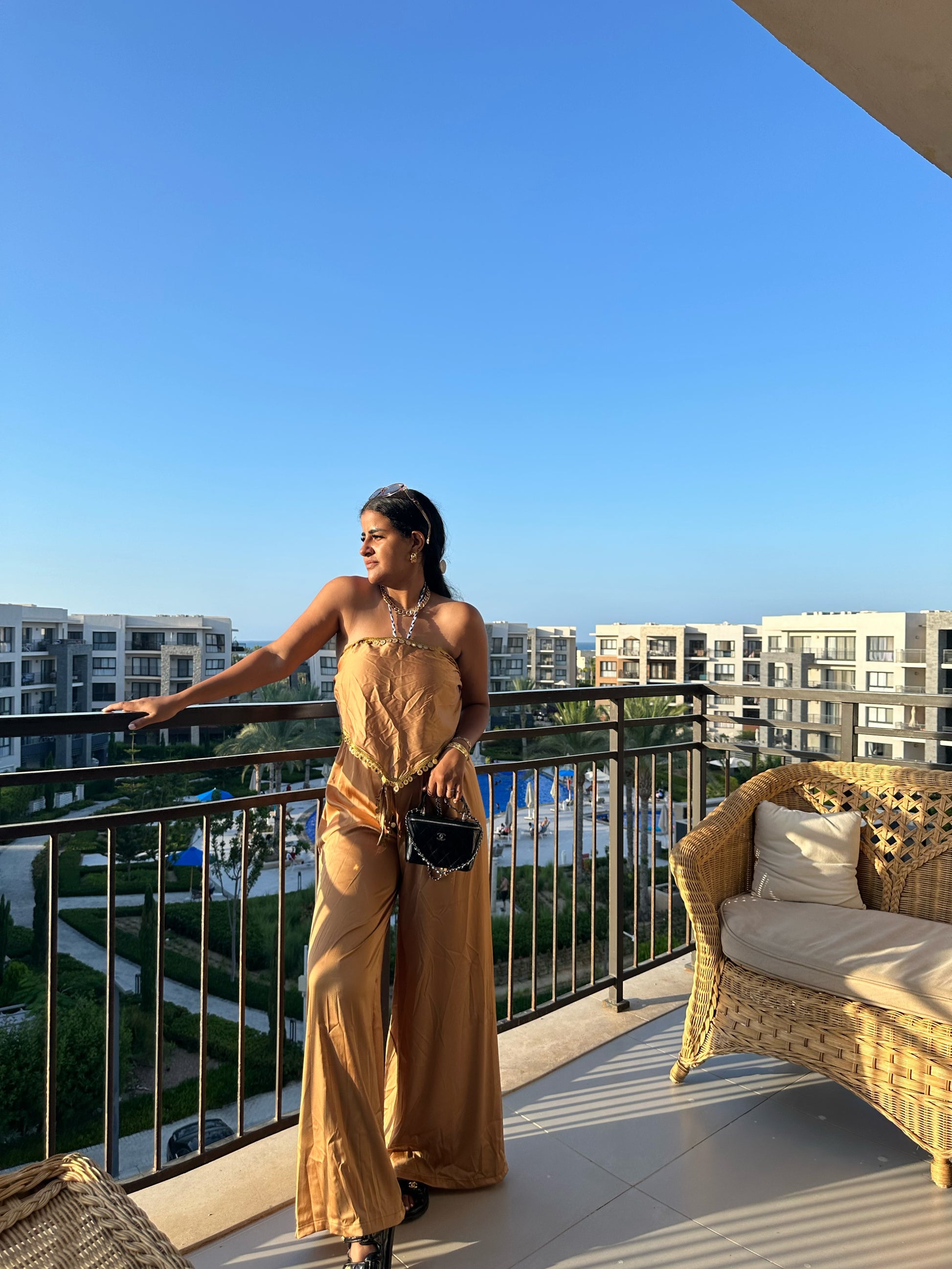 Unleash your inner beach babe with the Isla Set! This knit sleeveless top and gold pants combo is perfect for a day out. The triangle top adds a playful touch, and the hanging accessories from the neckline will make you stand out in a crowd. Get ready to rock this unique and stylish outfit!