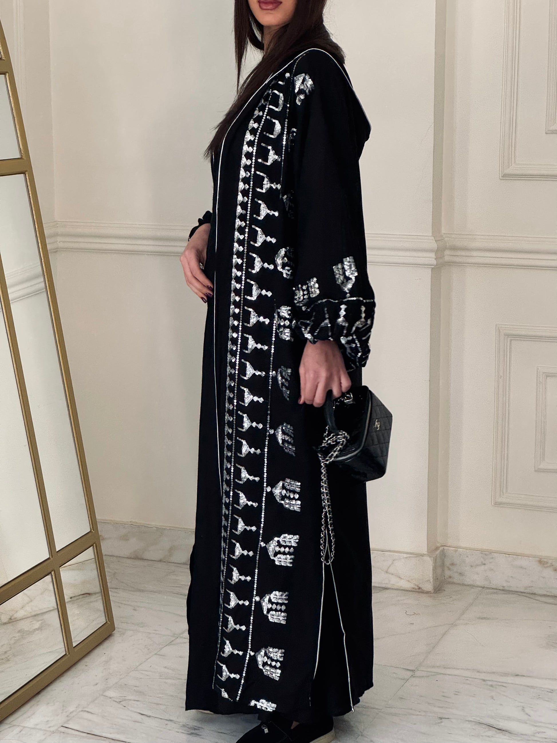 The Black Opal Kimono is a sleek and stylish statement piece. Made from flowy black fabric with silver embroidery, it’s perfect for dressing up or keeping it casual. Whether for Ramadan nights, special events, or everyday elegance, this kimono adds effortless charm to any outfit.