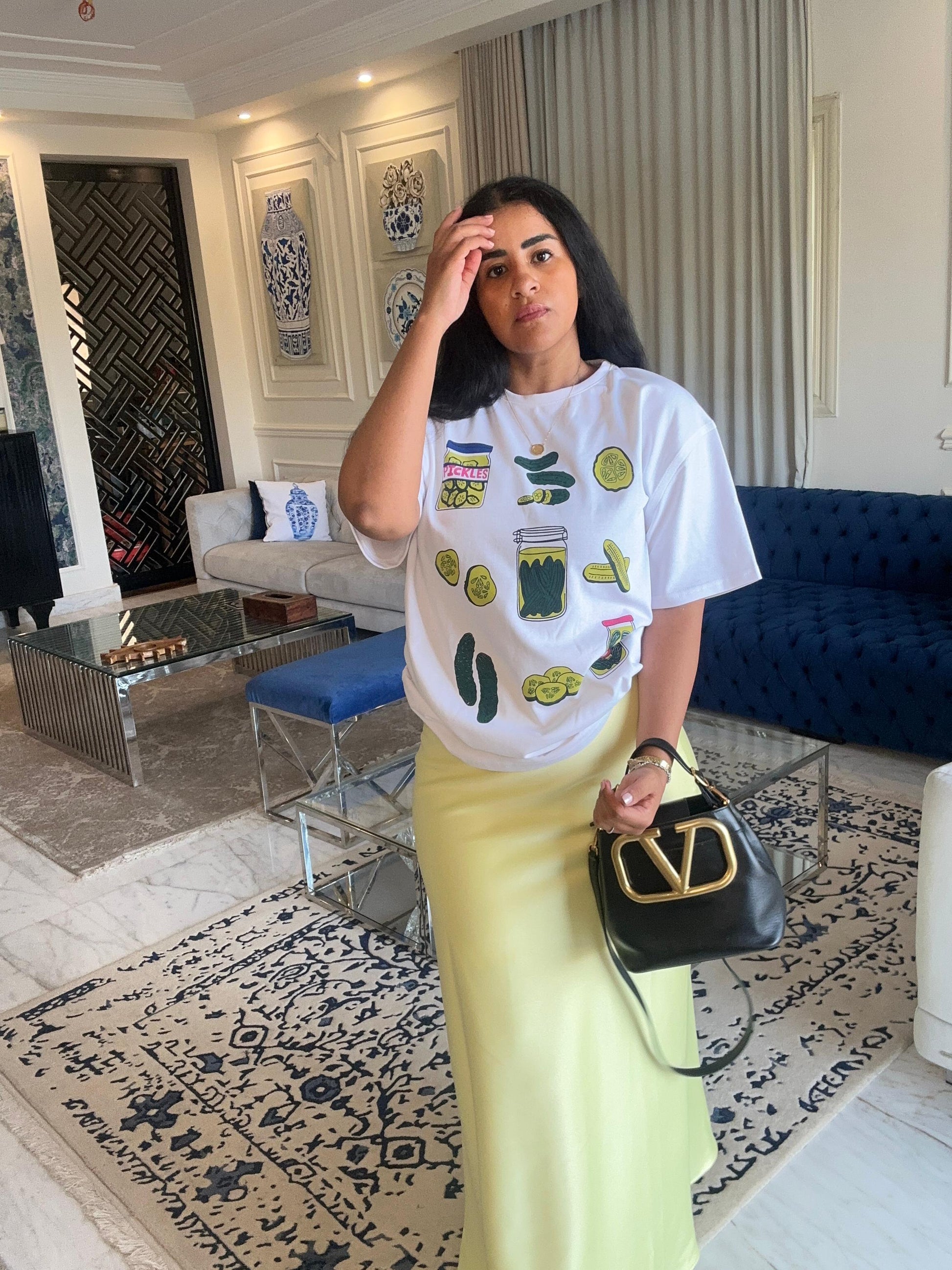 Introducing the Pickle Tee: the cool and quirky addition to your summer style. Made with fresh pickles (just kidding!), this tee will add some fun to your wardrobe. Perfect for those who don't take themselves too seriously. Kudos if you get the double meaning! (limit 2 exclamations)