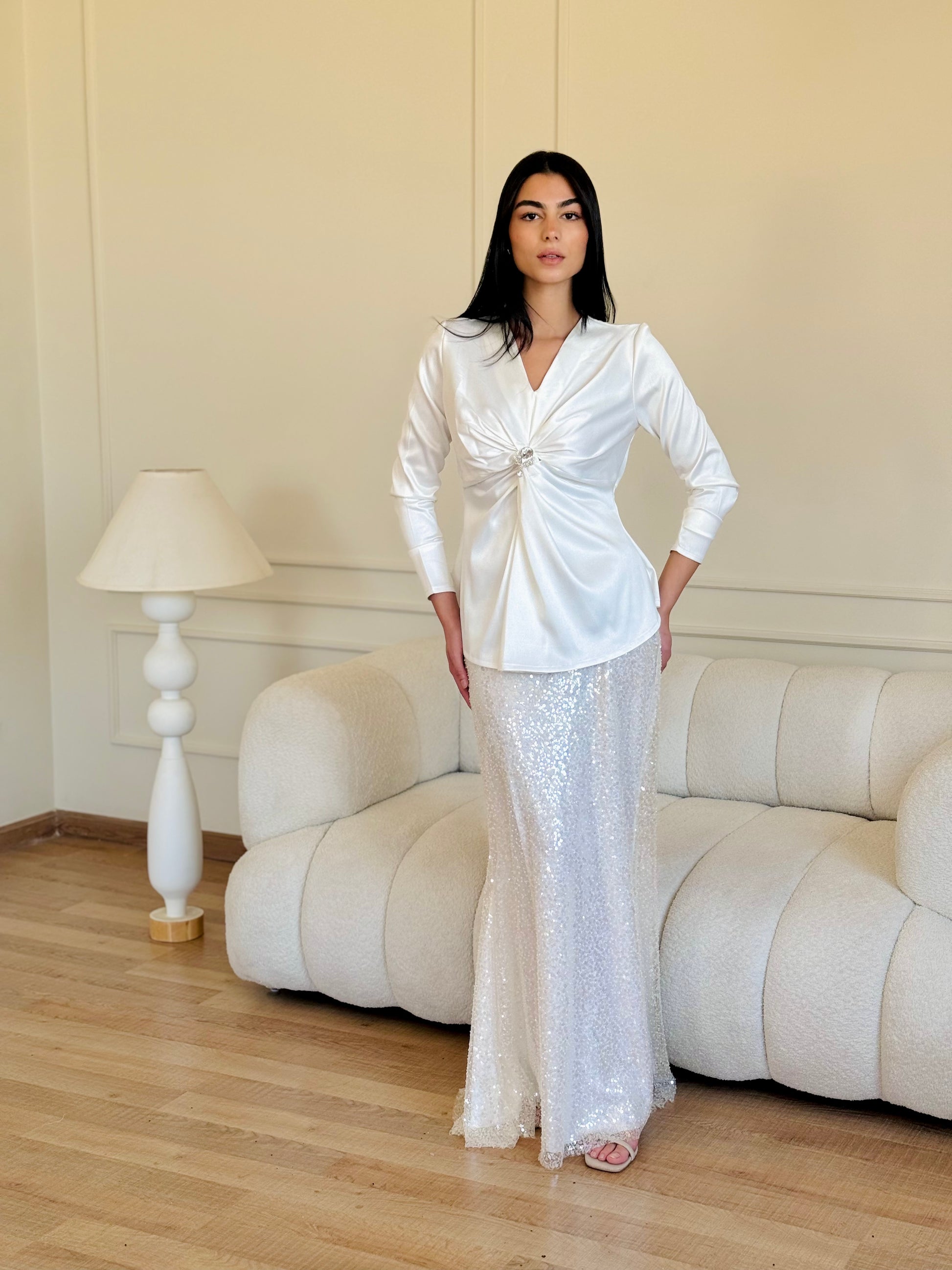 Indulge in effortless elegance with our White Elana Skirt. The smooth, flowy fabric drapes beautifully for a sophisticated and exclusive look. The long length and cute sassy design add a touch of luxury to any outfit. Elevate your style with this must-have piece.